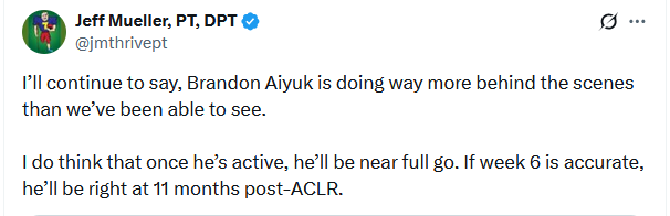 Aiyuk’s recovery was murky enough that he didn’t even make my first write-up. Now we have clarity, and cause for optimism.