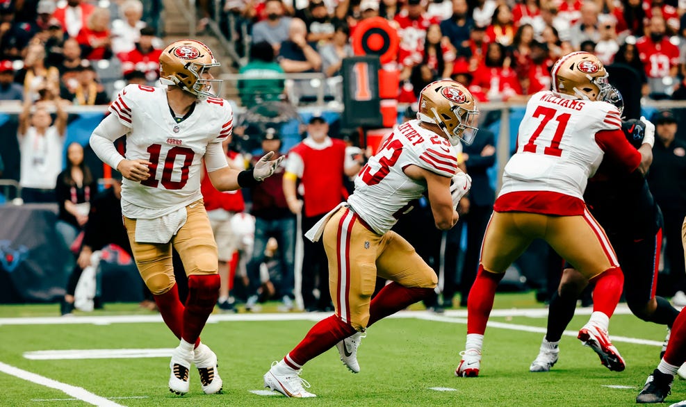 As Spongebob once said, “F is for friends who do stuff together.” In this case, the friends are the passing and rushing defense. What they did together on Sunday was play abhorrent football. Behind one of the worst offensive lines I have ever seen, Stroud dropped back and dissected the corpse of the 49ers defense (Happy Halloween!) Doing so to the tune of a 77% completion rate, 318 yards, two touchdowns and one interception.