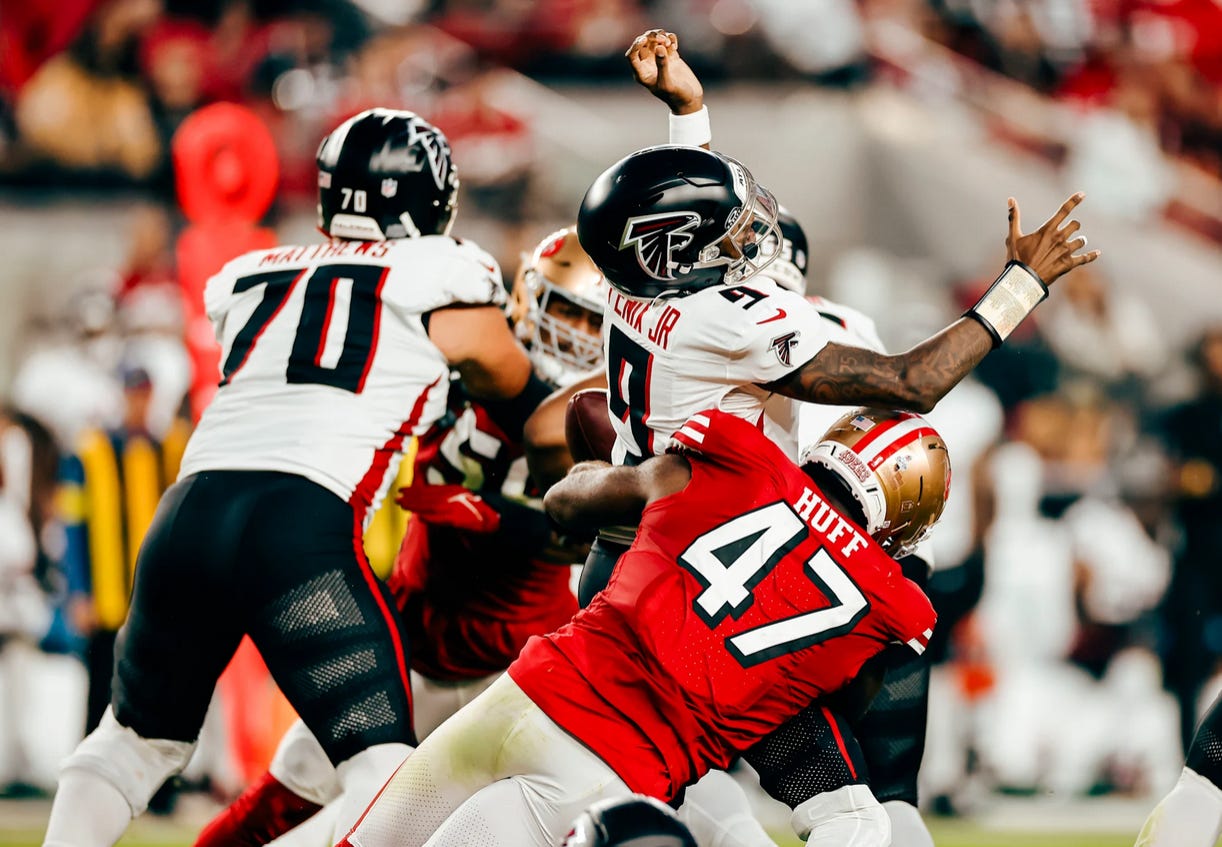 To complement the excellent run defense, the 49ers did a great job keeping the Falcons’ passing attack in check. Falcons quarterback Michael Penix Jr. rarely had a clean pocket to operate from. The Niners’ defensive line constantly harassed and hit him as he was throwing, preventing him from delivering accurate passes with anticipation. They’re credited with three sacks, four QB hits, and 15 hurries according to Pro Football Focus. Penix Jr. finished the night with a pedestrian 241 yards passing with one touchdown, and two sacks; one of which resulted in a fumble that the 49ers recovered.