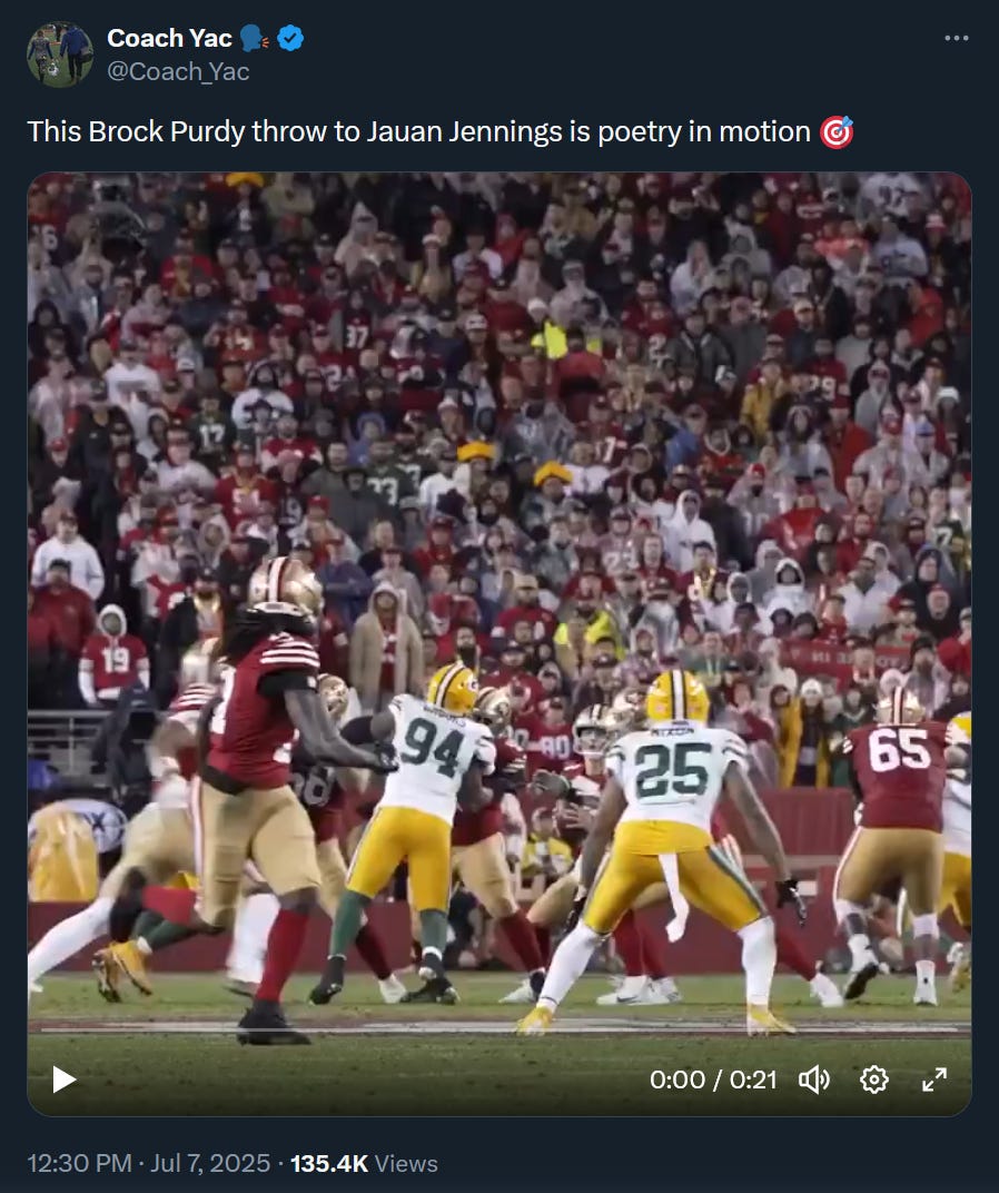 The gaudy receiving numbers were the result of his being thrust into the #1 role, with injuries ranging from Christian Mcaffrey’s calves, to Brandon Aiyuk’s ACL, Rickey Pearall’s gunshot wound, and Deebo Samuel’s pneumonia. What’s absolutely crucial for the 49ers, more so than any other receiving core in the league, is the hard hat, lunch pail, dirty work mentality he brings to the run game. Per PFF, Jennings was their 4th highest rated run blocking wide receiver in 2024. He approaches each and every blocking snap like the dude just insulted his mother. It often results in grown men getting their feelings hurt, even his own teammates. As Shanahan said through a grin, after Jauan threw a corner-back into his team’s benches, “He’s the type of guy who plays to the whistle, we had to have a talk with the defense about it at practice, they kept taking it personal.” Iron sharpens iron.