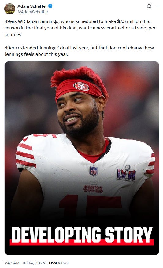 It appeared the San Francisco 49ers were finally going to make it out of the offseason free of drama, but once again the fandom will have to stress over another contract dispute. Emerging wideout Jauan Jennings is reportedly seeking a contract extension or a trade, via Adam Schefter on X Monday morning.