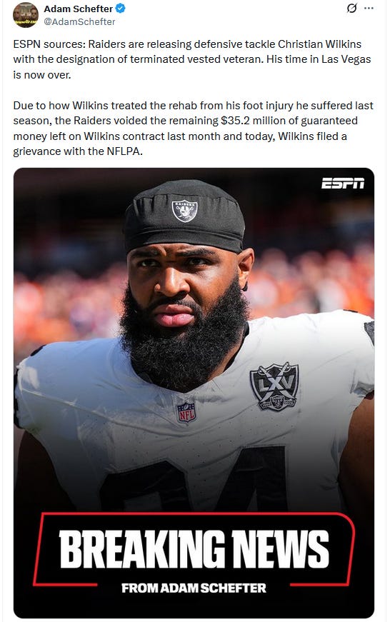There’s a good chance Wilkins misses most, if not all, of the 2025 season. The Raiders turned over leadership this off-season, so perhaps they weren’t too keen on Wilkins anyway, but odds are they would’ve been willing to work with him if they thought he could make an impact on a thin defense. Their moving on outright suggests there wasn’t a good outlook on his short or long-term health.