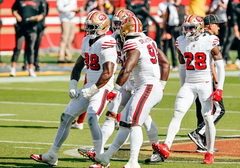 It’s clear at this point that this team can’t have nice things, and Sunday was no exception. This week, it was Nick Bosa’s turn to have the Faithful sweat, exiting the game early with a knee injury. We will hold our collective breath awaiting the results of an MRI to see the severity and how much time will be missed. Mykel Williams and CJ West also left briefly, but did return.