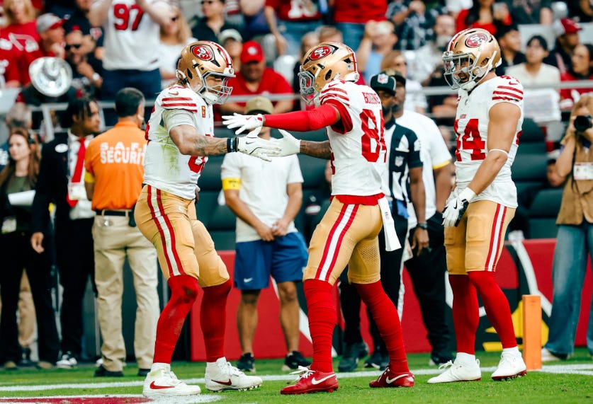 This week a report broke that the San Francisco 49ers are the best travelling fan base in the NFL. They lived up to it and then some at State Farm Stadium on Sunday. Jacoby Brissett noted that he had never had to go silent at home in his career: “It blows my mind that an away team could be that loud.” There is no more fitting location for the return of Arizona natives Brock Purdy and Rickey Pearsall to the starting lineup. Their friends, family, and 49ers fans around the world watched as the 49ers offense showed out. Here are your week 11 grades: