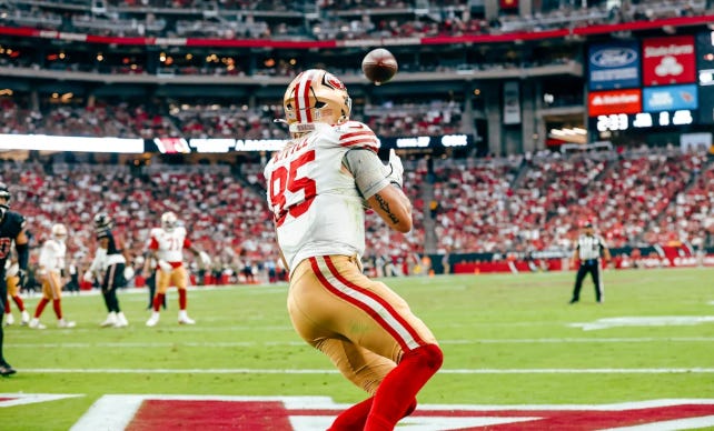No player seemed to be unlocked by Purdy’s return more than George Kittle on Sunday. His six receptions for 67 yards were jump started by his first touchdown, an explosive 30 yard touchdown pass down the right side of the field. It was his second touchdown however that put Kittle in rarified air in San Francisco. It would be his 50th touchdown catch as a Niner, joining only Hall of Famers Jerry Rice and Terrell Owens as the only players in team history to achieve that feat.